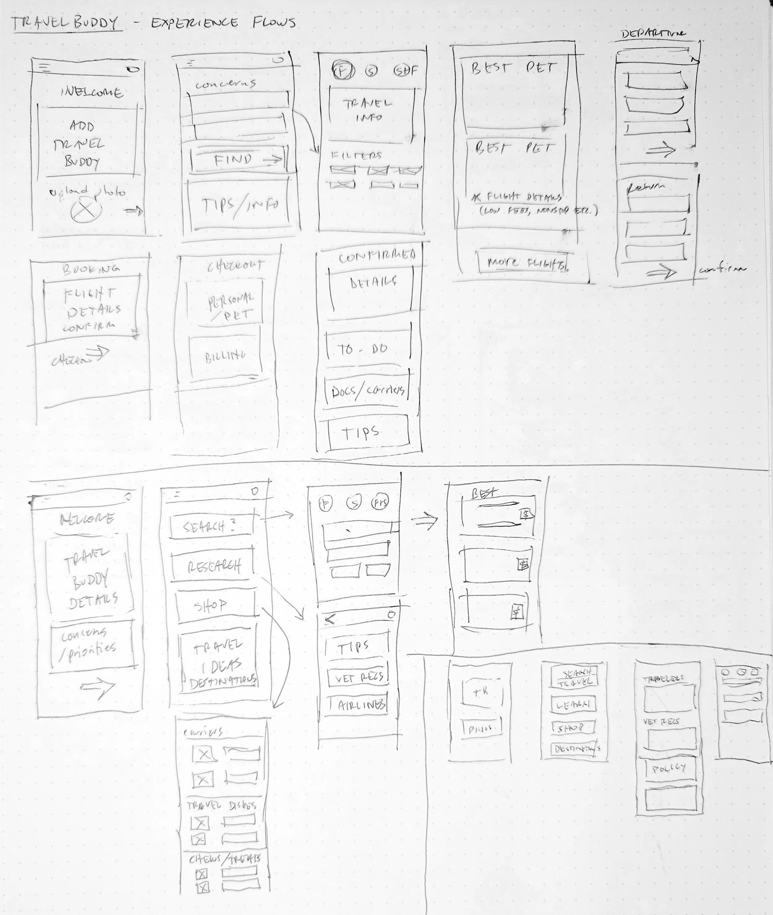 Armed with logos, brand colors, journey maps and user flows, I proceeded to develop the key features of the website. I really focused on what separates TravelBuddy.com from the other booking sites, and began to develop features that would not only excite users but really bring value to the site and make it their go-to destination for pet travel.User Experience Flows & Initial Wireframes Sketches